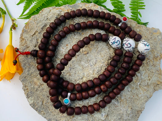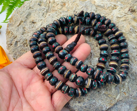 Natural Yak Bone With Coral Inlay 108 Beads Prayer Mala