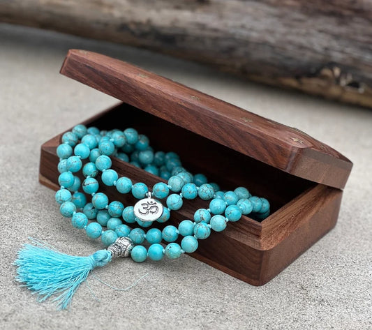 Tibetan Turquoise Chakra 108 Beads Mala Meditation Yoga With Silver Guru Bead, Silver Spacers And Mala Wooden Box