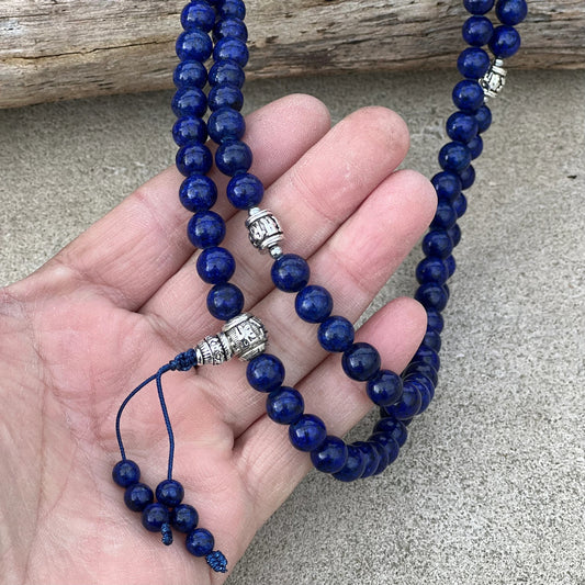 Tibetan Prayer Meditation Healing Lapis Lazuli 108 Beads Mala With Silver Guru Bead , Silver Spacers
