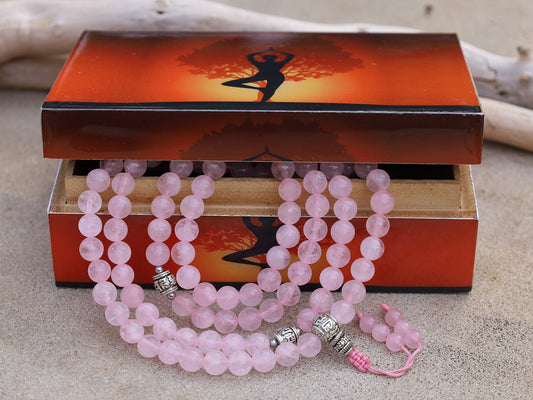 Tibetan Rose Quartz 108 Beads Mala Meditation Yoga With Silver Guru Bead, Silver Spacers And Mala Wooden Box