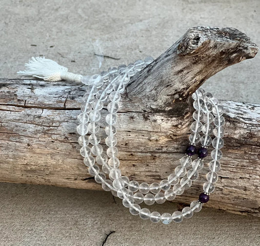 Tibetan Genuine Rock Crystal Mala Rosary 108 Amethyst Markers Silver Spacers Free Box