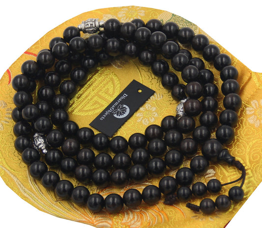 Tibetan Mala Buddhist Prayer Beads Rosary Ebony Wood With Silver Spacers Free Silk Pouch