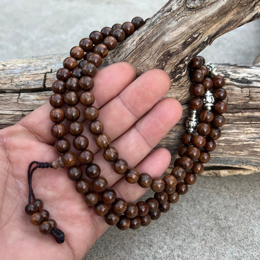 Tibetan Buddhist Kadam Wood 108 Beads Mala with 3 Silver Markers + Free Silk Pouch