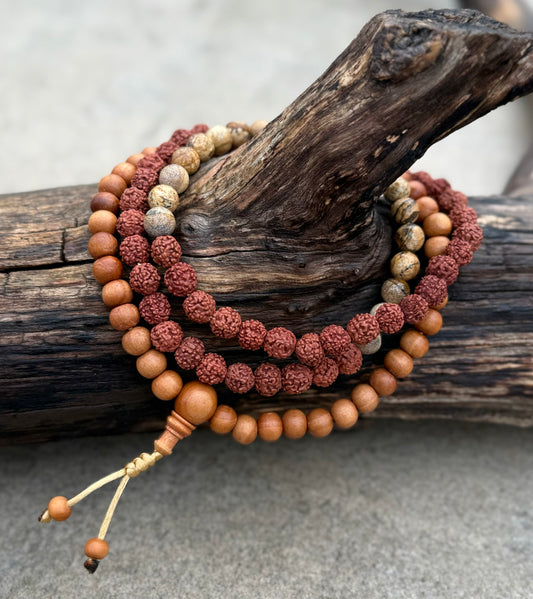 Natural and Gemstone Sandalwood, Rudraksha, and Brown Agate 108 Beads Prayer Mala