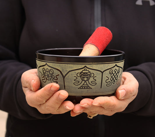 Tibetan Singing Bowl Complete Set Eight Lucky Symbol With Mallet and Cushion ~ For Meditation, Chakra Healing, Prayer, Yoga