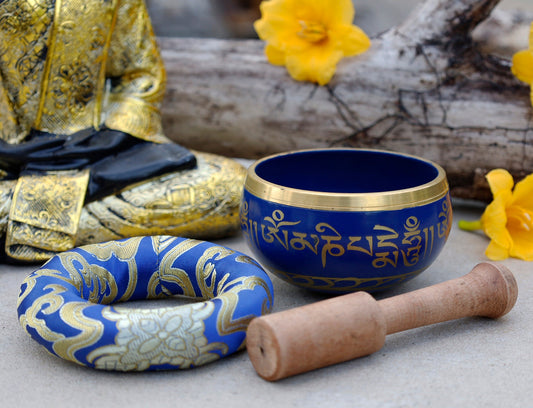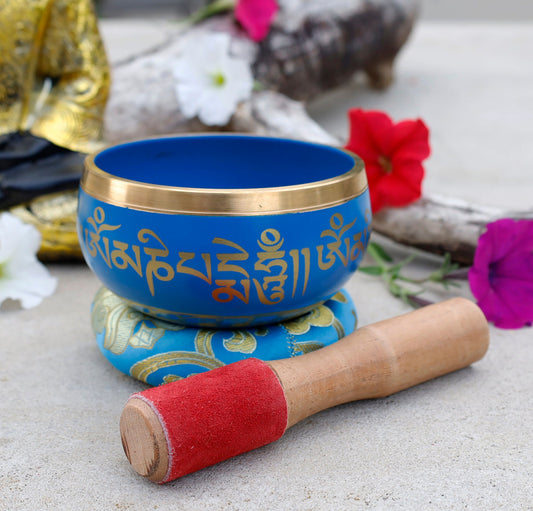 Tibetan Singing Bowl Complete Set Om Mani Padme Hum With Mallet and Brocade Cushion ~ For Meditation, Chakra Healing, Prayer, Yoga