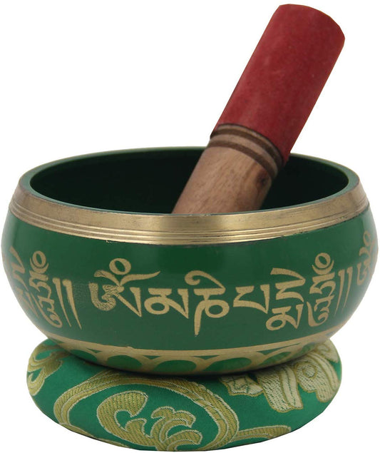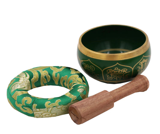 Medium ~ Tibetan OM MANI Singing Bowl Set ~ With Mallet, Brocade Cushion & Carry Bag ~ For Meditation, Chakra Healing, Prayer, Yoga (Green)