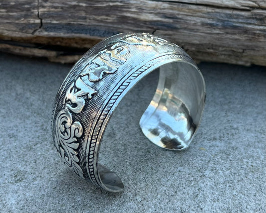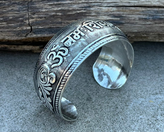 Tibetan Mantra OM Mani Padme Hum Silver Cuff Bracelet | Handcrafted Spiritual Jewelry