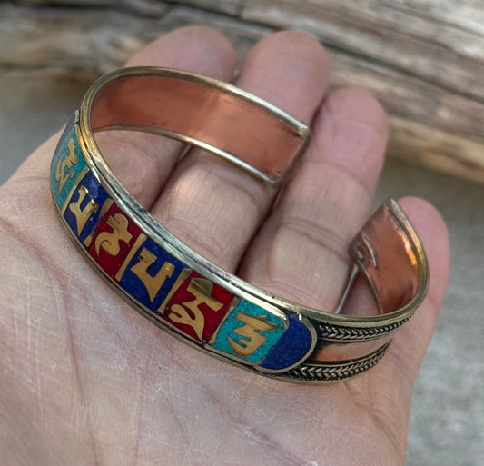 Copper "Om Mani Padme Hum" Bracelet with Stone Inlay - Handcrafted in Nepal