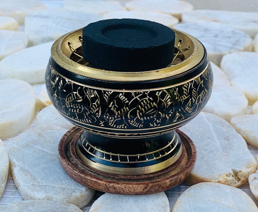 Decorated Brass Charcoal Screen Incense Burner with Wooden Coaster 3 Pcs Set 2” Tall