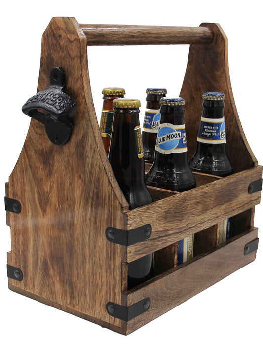 Handcrafted Wooden Bottle Caddy, 6-Pack Beer Carrier with Metal Bottle Opener