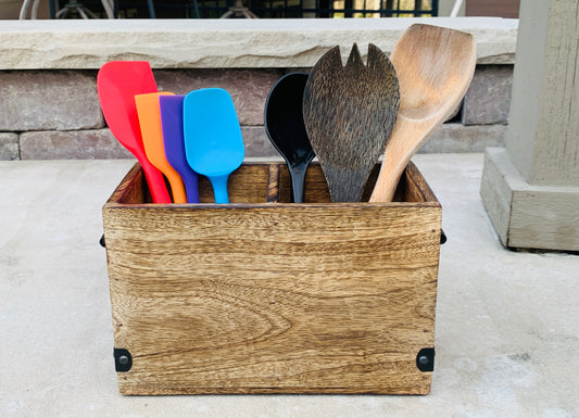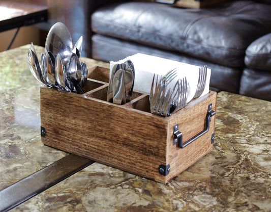 Mango Wood Utensils Caddy, Holder for Spoons, Forks, Knives, Salt Pepper, Napkins, Silverware Organizer, Flatware Holder