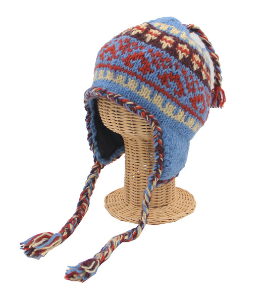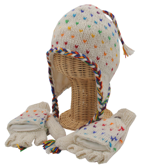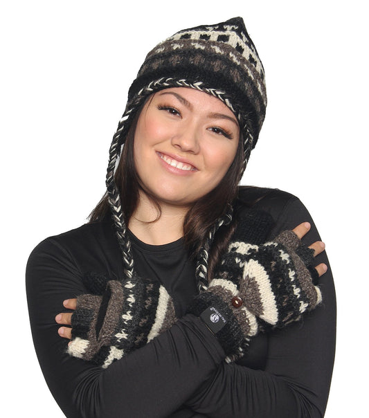 Nepal Hand Knit Ear Flaps Beanie Ski Wool Hat & Glove Mitten Set