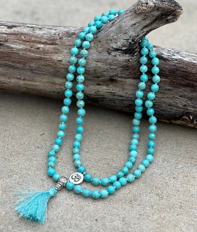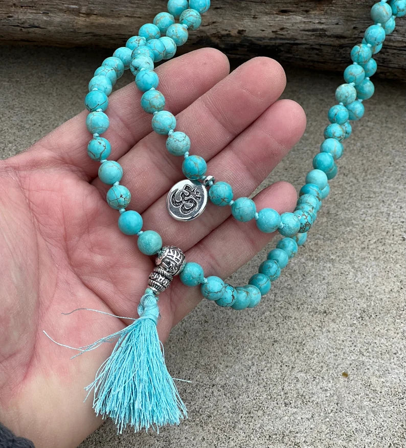 Tibetan Om Healing Stone 108 Beads Knotted Mala Prayer Meditation Yoga Chakra With Silver Guru Bead And Free Wooden Gift Box