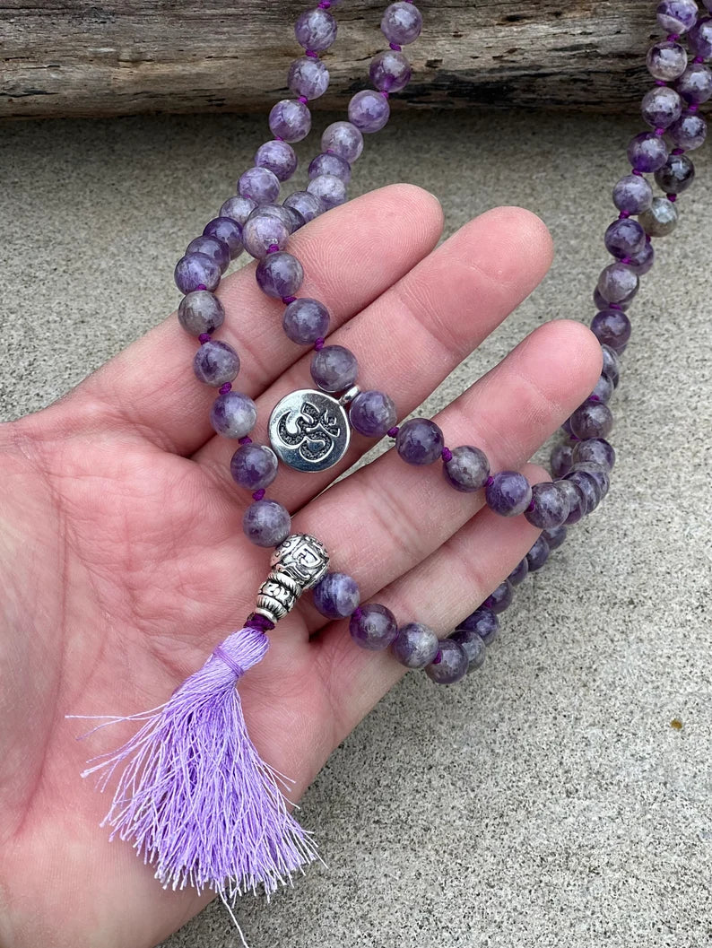 ❤ Hand-Picked one of a kind, carefully hand knotted Genuine Amethyst and Turquoise, 108 Beads Mala with Traditional Tibetan Silver Metal Guru Bead and Tibetan Silver Metal Buddha charm.