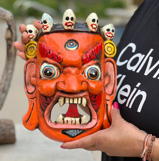 Hand Carved Tibetan Buddhist Mahakala Wooden Mask Wall Decor Hanging Orange