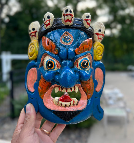 Hand Carved Tibetan Buddhist Mahakala Wooden Mask Wall Decor Hanging Blue