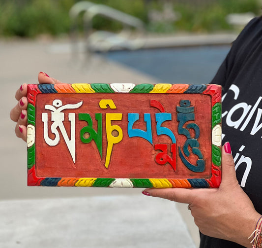 Hand Carved Painted Tibetan Buddhist "Om Mani Padme Hum" Sign in Wood