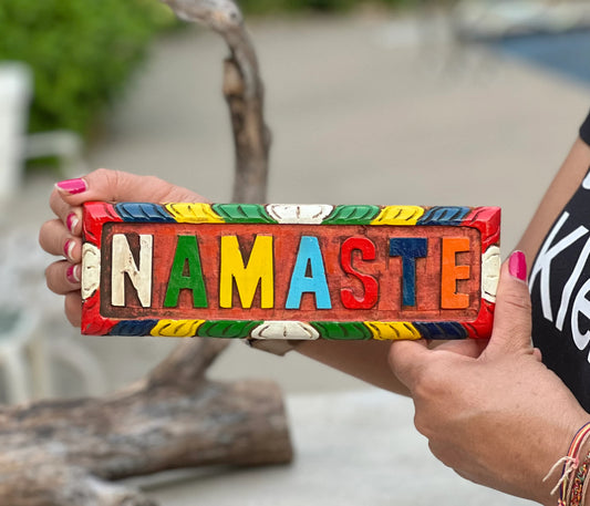 Hand Carved Painted "NAMASTE" Sign in Wood, Nepali Greeting "NAMASTE" Wall Hanging Decor Nepal