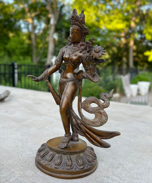 Huge Standing Tara Female Buddha Statue Solid Brass Antique Copper Finish for Home Altar Shrine Meditation Room 15 Inches Tall Weighs 10 lb